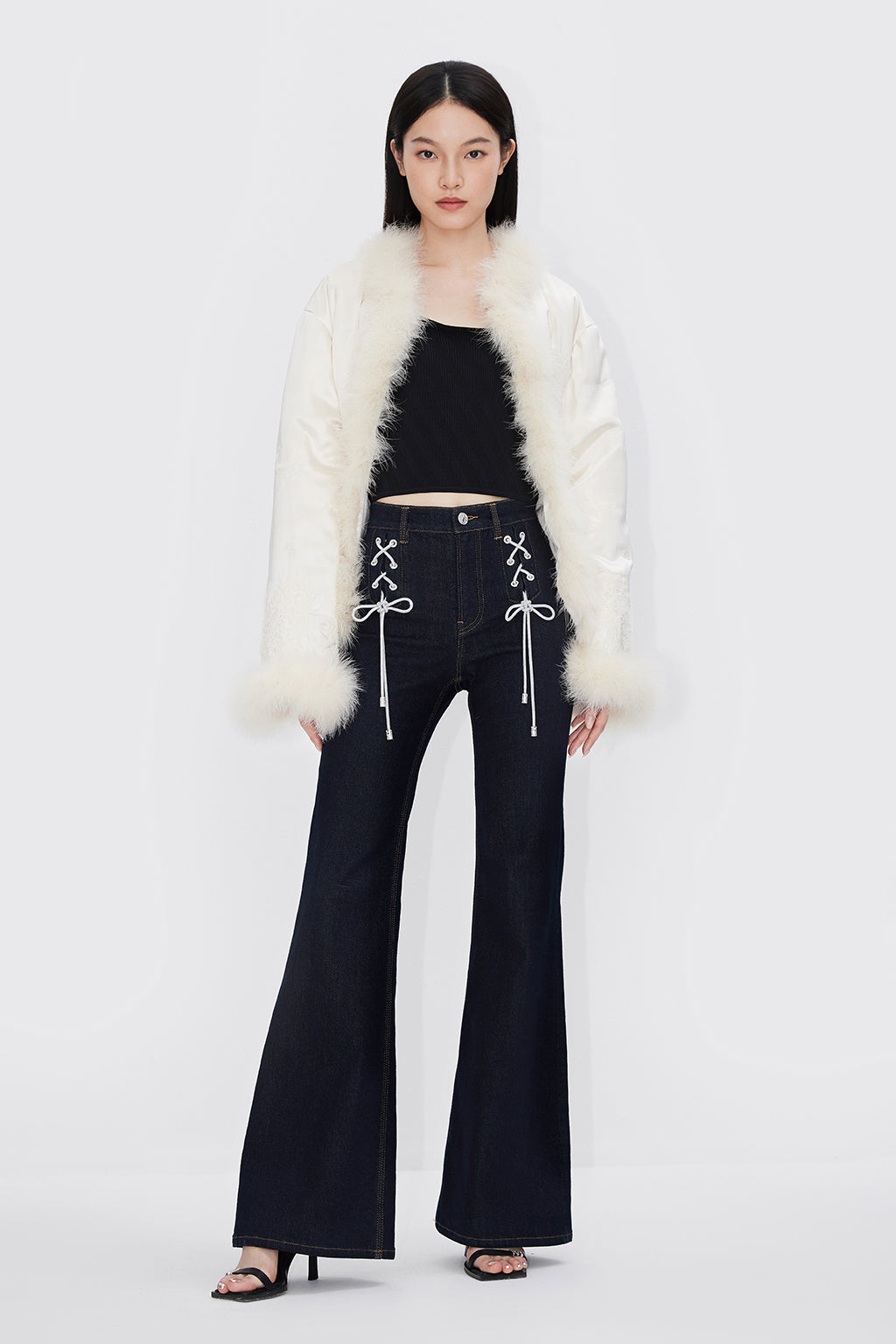Carefully chosen Chanel-style floral mesh fabric, premium duck down filling for a soft and warm touch. Crafted with luxurious paper-like yarn, it's as lightweight and graceful as a butterfly. The elegant V-neck design, meticulously stitched edges, highlights the brand's craftsmanship. Symmetrical decorative pockets enrich the details, while shimmering pearls add subtlety and sophistication.
