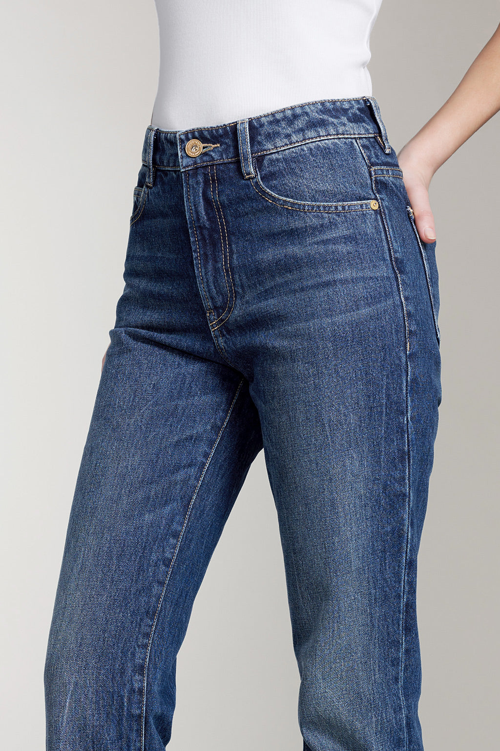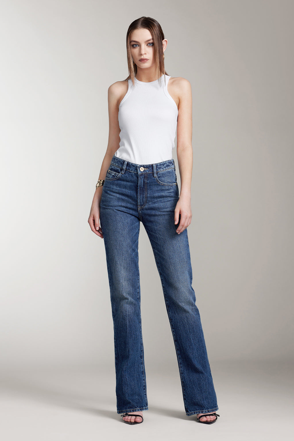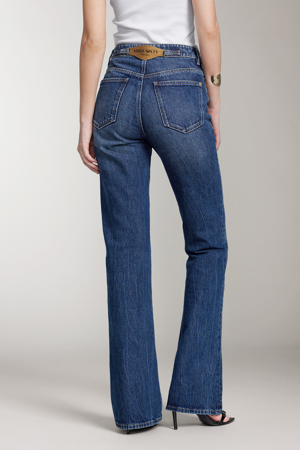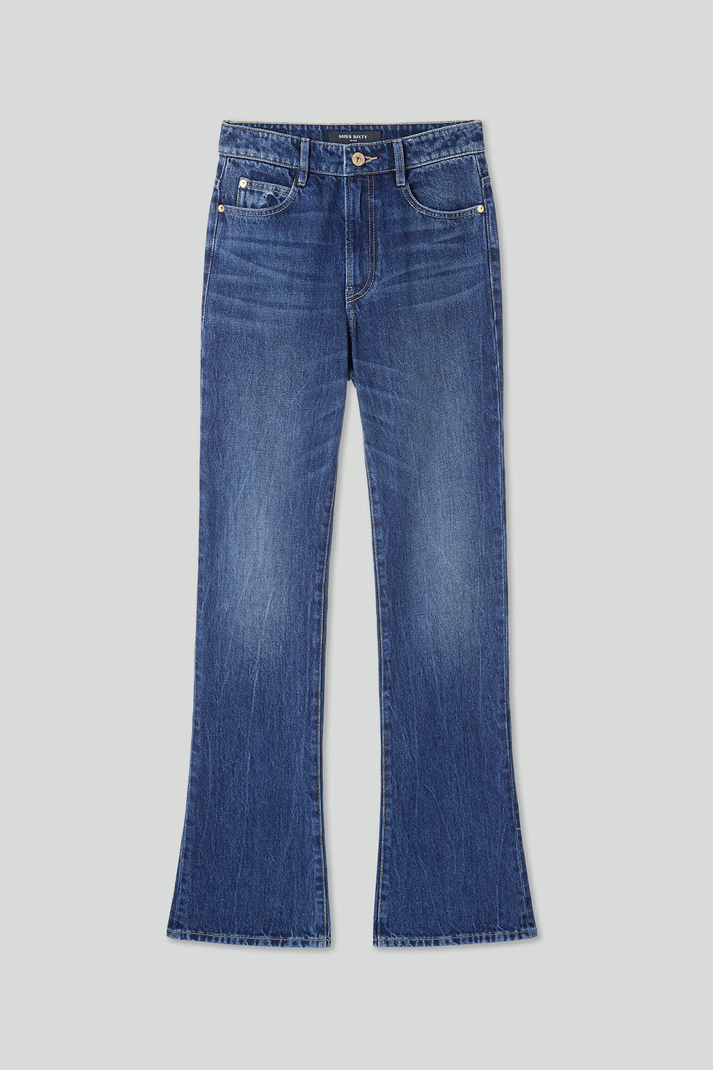 This brushed blue denim fabric is soft yet retains its shape, featuring a unique yarn arrangement that creates irregular stripe effects for a rich, textured slub style. The brushed underside adds a fine, soft feel, making it both warm and comfortable to wear. The high-waisted design wraps comfortably around the waist and abdomen, accentuating the body's curves. A brown leather patch contrasts with the vintage-wash blue, offering a fresh and distinctive visual appeal. The retro slight flare at the hem enhances the leg shape, providing a slimming effect and showcasing a chic, modern style.
