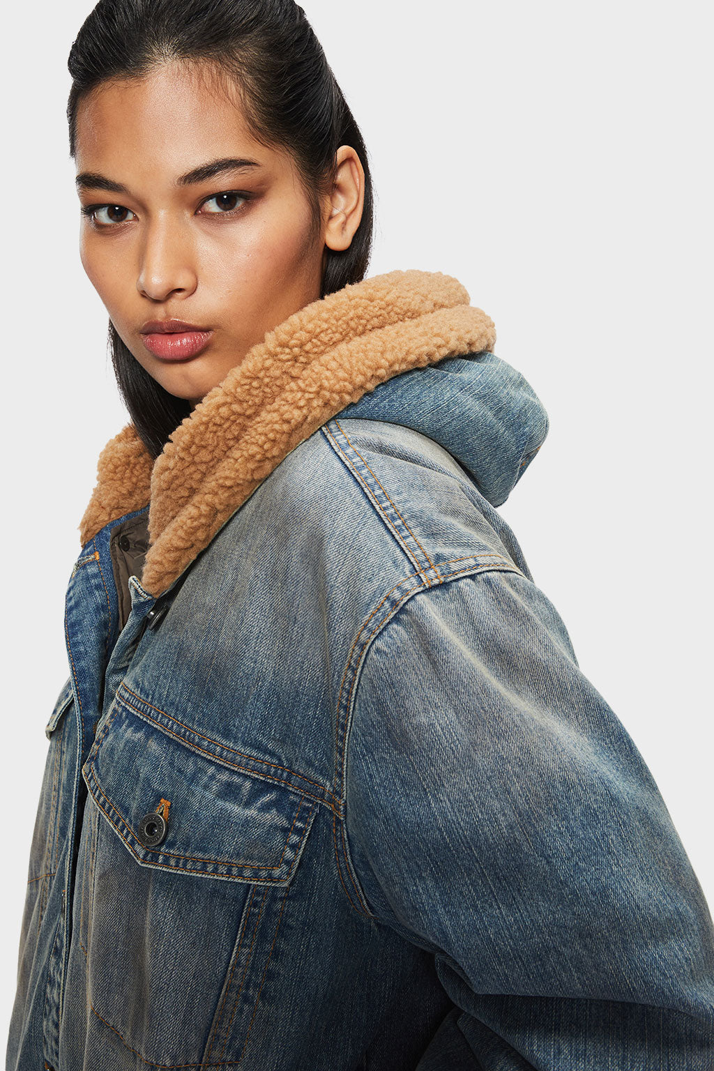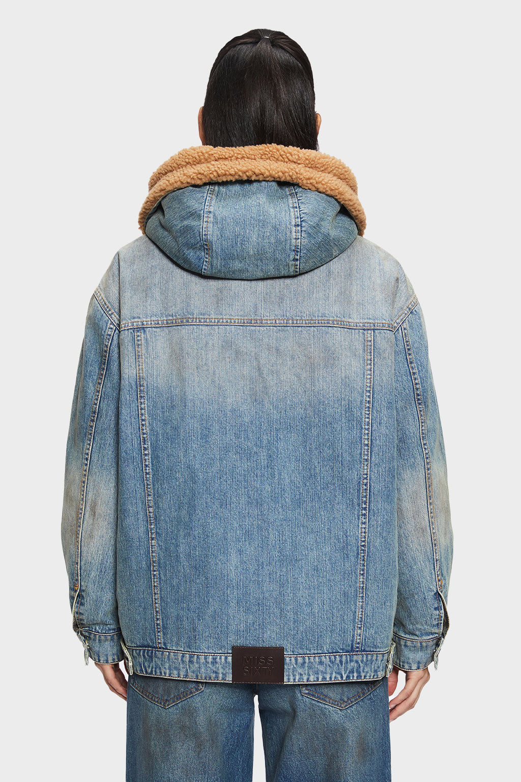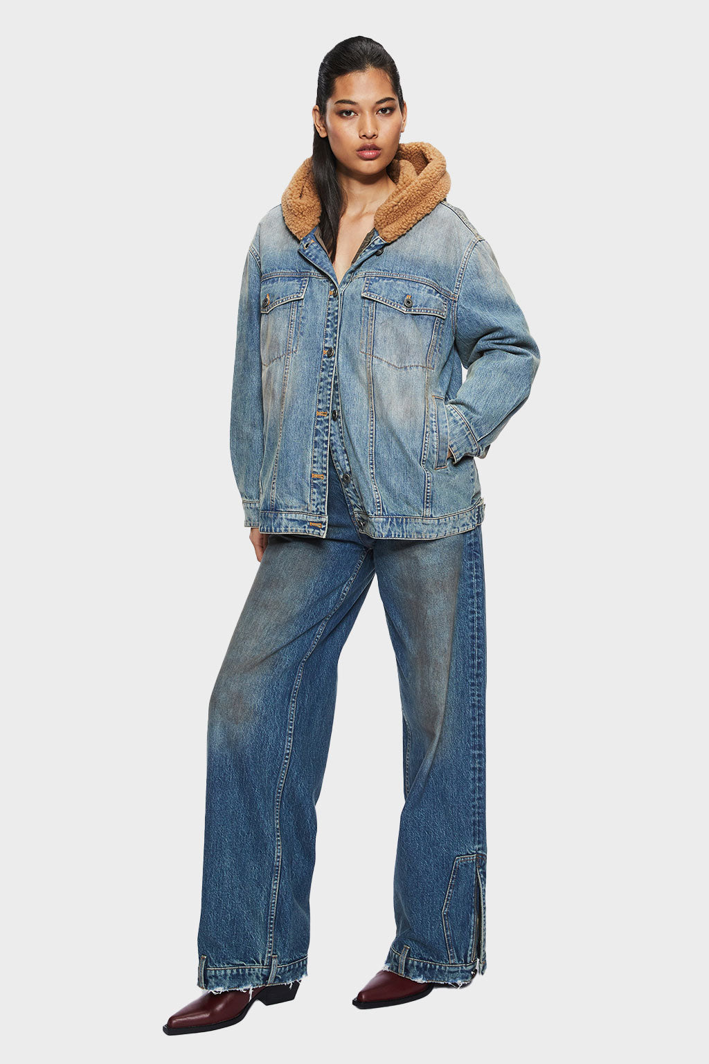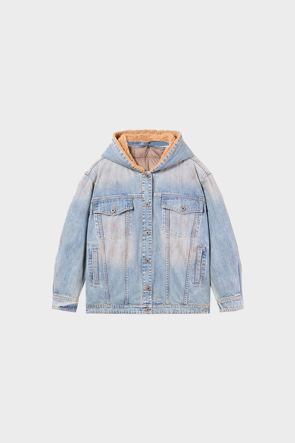 vertical slub texture, this fabric features clear lines and a structured, well-defined shape. Treated with enzyme washing, stone washing, and other techniques, it presents a naturally vintage denim texture and pattern. The front placket is adorned with cargo-style pockets, adding layering and enhancing a casual style. The back strap detail elevates the fashion quotient, showcasing a cool and distinctive style. The adjustable button hem allows for a customizable fit, accommodating various body shapes.