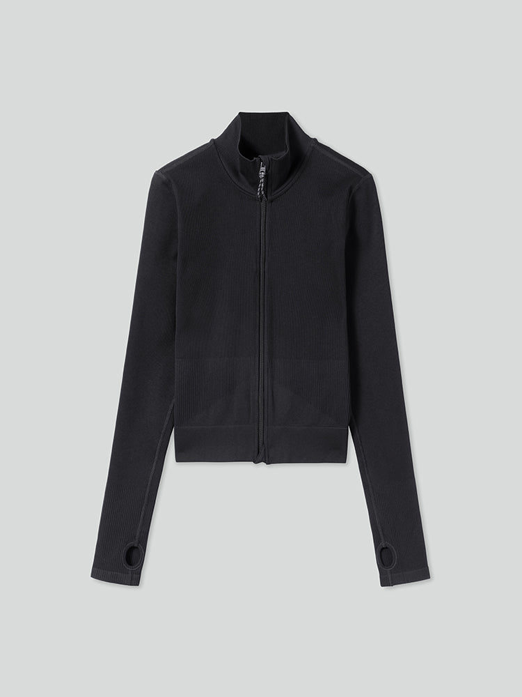 Made from a blend of nylon yarn and elastic fibers, this fabric features a tight-knit outer layer that retains softness. The ribbed texture and rebound properties provide excellent support and a snug fit, creating a slimming effect. The stand collar is crafted from soft knit material, comfortably hugging the neck. The contrasting drawstring zipper adds a fashionable, eye-catching detail. The hem showcases a variety of stitching techniques, enhancing texture and giving the garment a high-quality, refined appearance. The form-fitting long sleeves feature thumbhole cuffs, adding a casual, sporty touch.