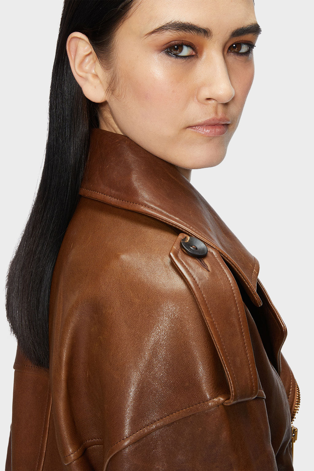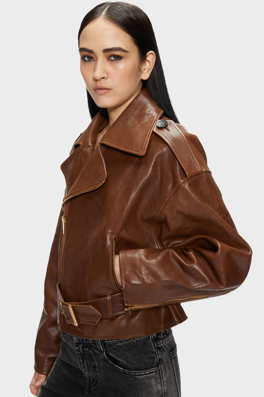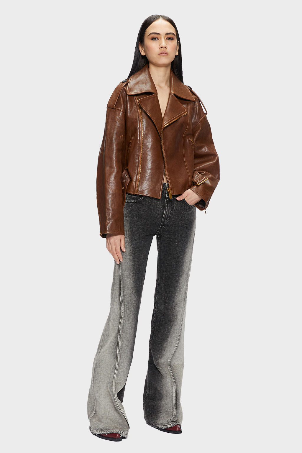 Carefully selected high-quality sheepskin leather, with clear and attractive grain patterns. The texture is soft and smooth, with a fine and even grain surface that exudes a pearl-like soft and subtle luster, showcasing natural luxury. Rebellious and distinctive leather jacket outfits effortlessly shape an urban style. The delicate leather texture highlights a sense of luxurious beauty, pairing with denim pants for an unrestrained interpretation of rock style.