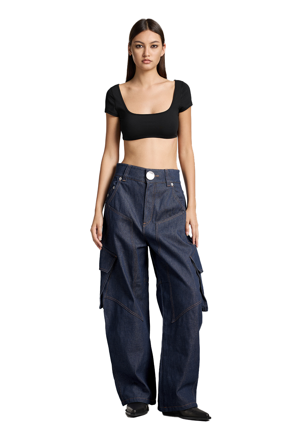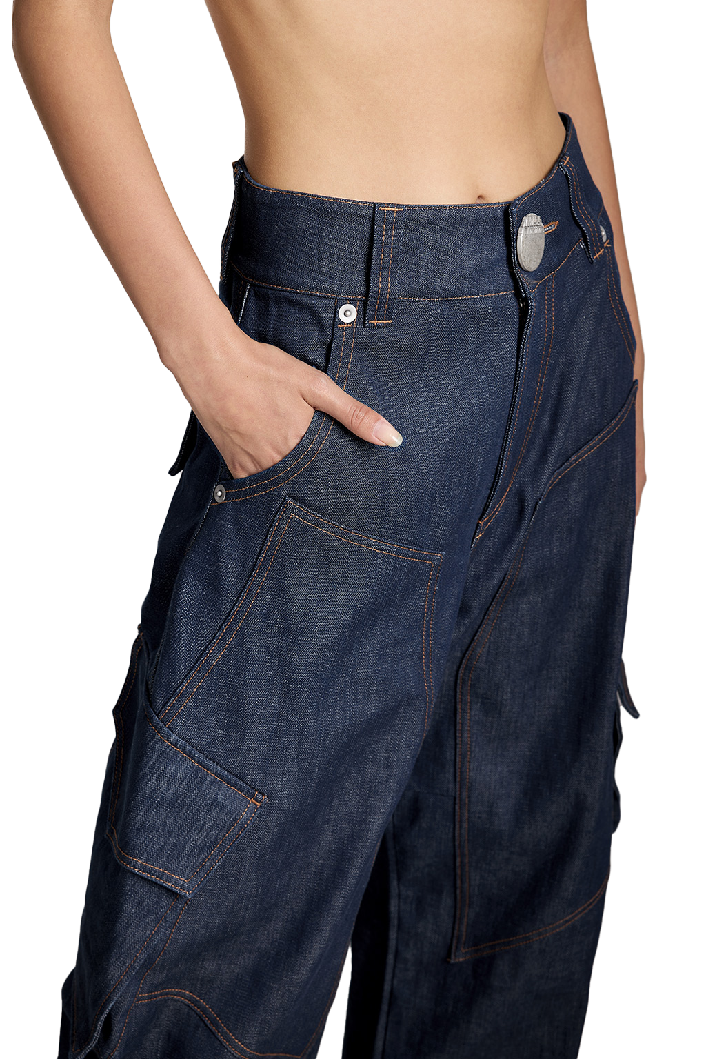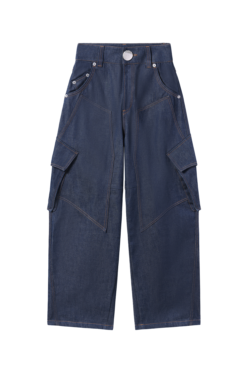 Crafted from pure cotton non-stretch denim fabric, featuring a warp and weft with a bamboo joint style, the fabric exhibits clear grain patterns and a tight, compact feel. Through meticulous weaving techniques, each piece is unique, interpreting the texture and versatility of vintage denim. The front waist is adorned with irregular distressed designs and complemented by whisker patterns, exuding a bold and cool charm. The brown leather patch harmonizes with the vintage dark blue wash, while the York seams enhance the waist and hips, enhancing a playful and lively silhouette. The wide-leg silhouette offers a relaxed fit with ample room, adorned with unique frayed edges on each piece, emphasizing its youthful and stylish appeal.