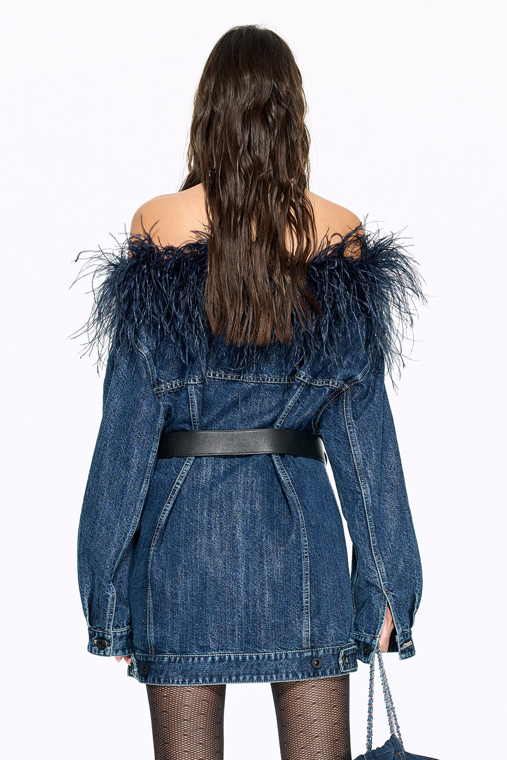 Crafted from a blend of mulberry silk and four-way stretch denim, this fabric is soft and elastic, offering exceptional comfort. The inclusion of Lyocell and linen fibers adds a refreshing feel, while the stretch blend ensures freedom of movement without any tightness. The design features a classic shirt collar, exuding confidence and a polished style. Bold and avant-garde elements in the pants' design bring a fashionable and unique touch. The combination of a cropped hem and a tailored silhouette creates a sleek, chic appearance.