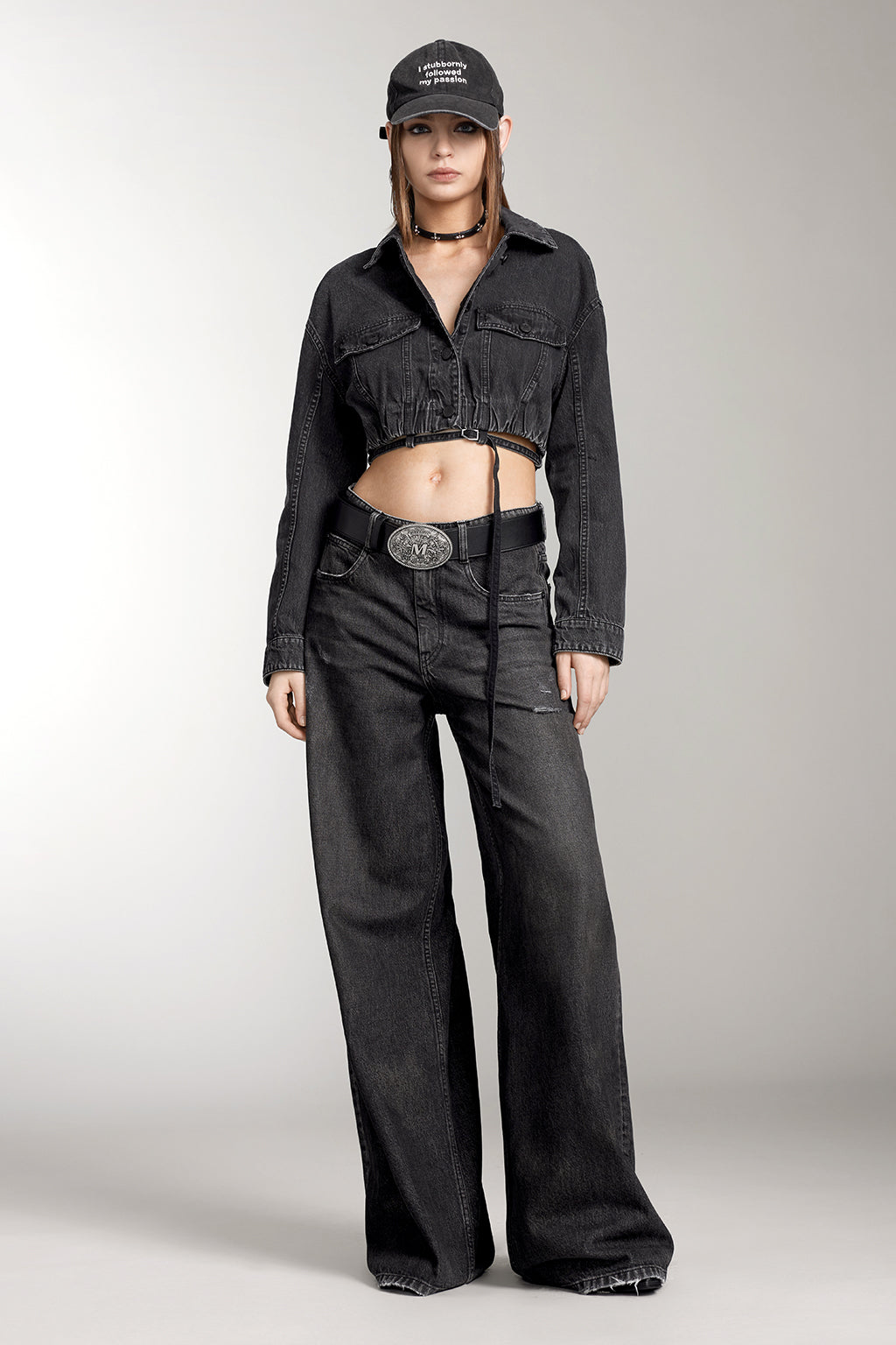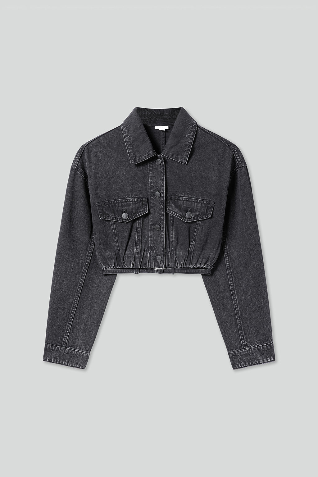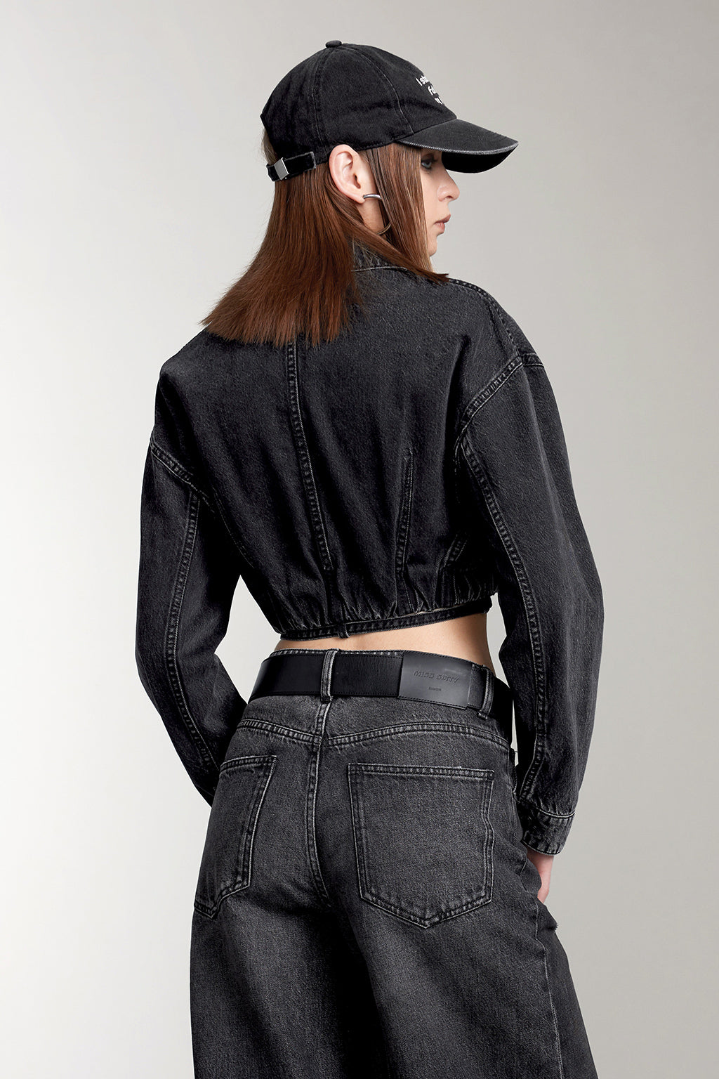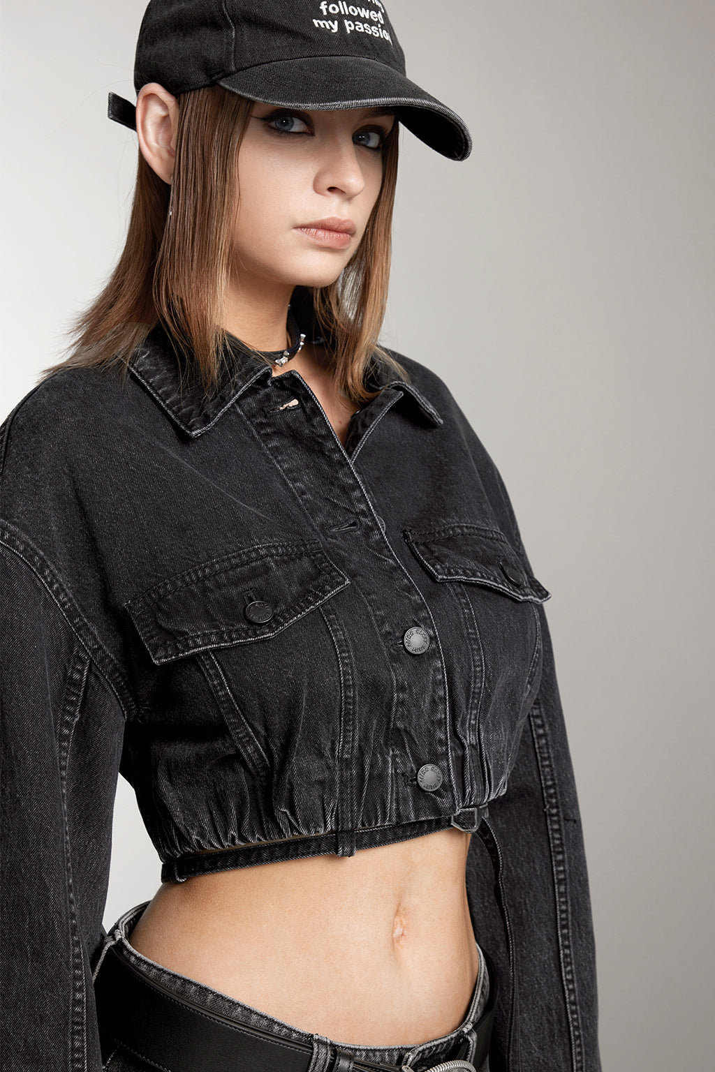 Crafted from premium non-stretch black denim made of 100% cotton, this fabric features a tightly woven structure with a soft and comfortable feel. The material is detailed with clear textures and a structured, stylish look. Multiple washing techniques, including enzyme washing, give it a naturally worn-in, vintage appeal. The shirt’s clean, simple collar enhances its retro, distressed style, adding a touch of individuality. The cropped design highlights the waistline with a tie detail that accentuates a cool, street-chic vibe. The shirt's cuffs are neatly finished with black buttons, accentuating the slim lines of the arms.