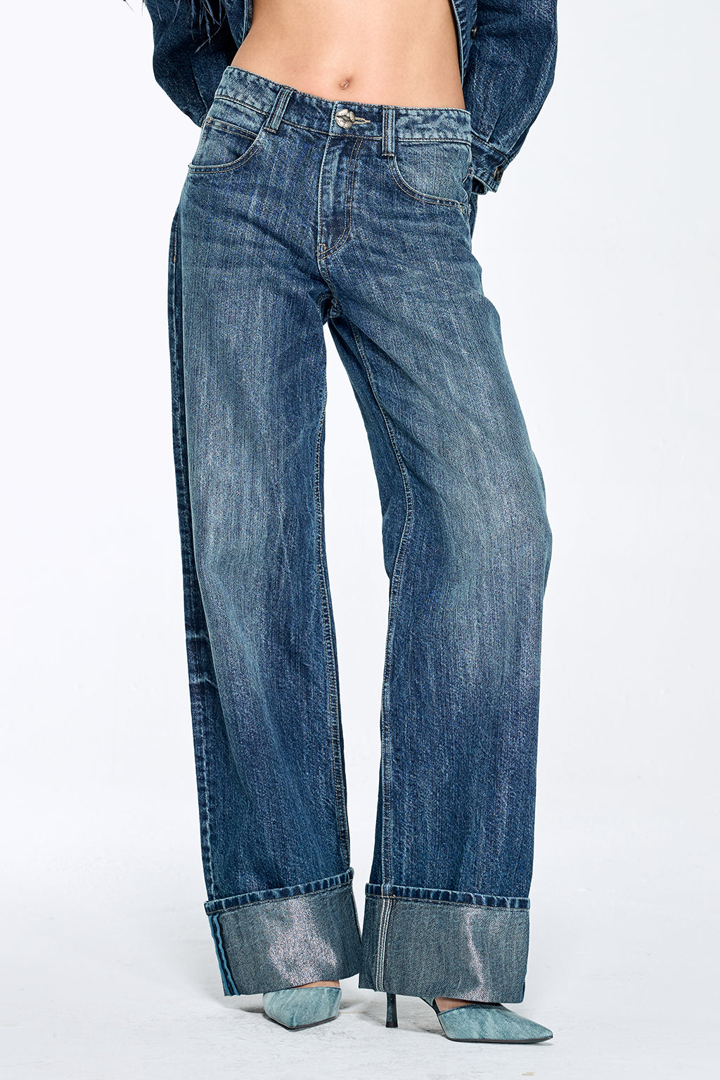 Made from Turkish cotton with long fibers and a natural sheen, this fabric provides a skin-friendly and comfortable feel. The denim features a rugged texture with prominent slubs and has been treated with vintage washes and processes to offer a unique, stylish appearance. Custom copper buttons and studs complement the distressed details of the pants, enhancing the retro vibe. The leather label, with its natural crinkled texture, adds a distinctive touch. The slimming tapered cut and distressed leg design create a varied, retro visual effect, with each piece offering a unique vintage look.