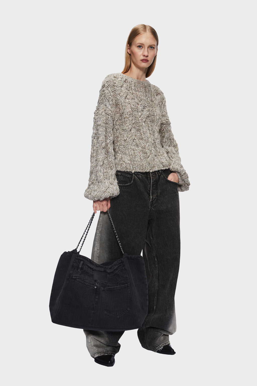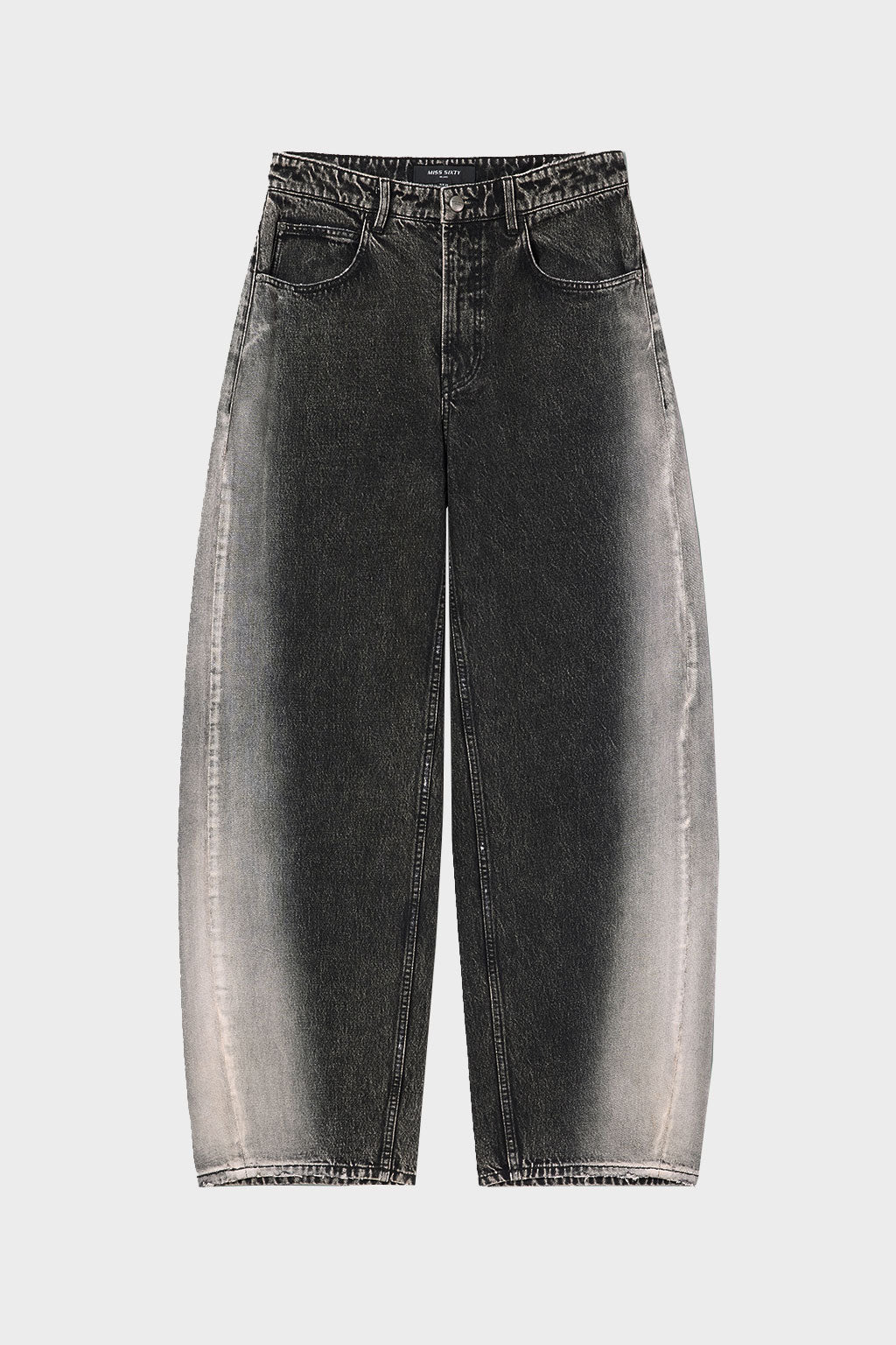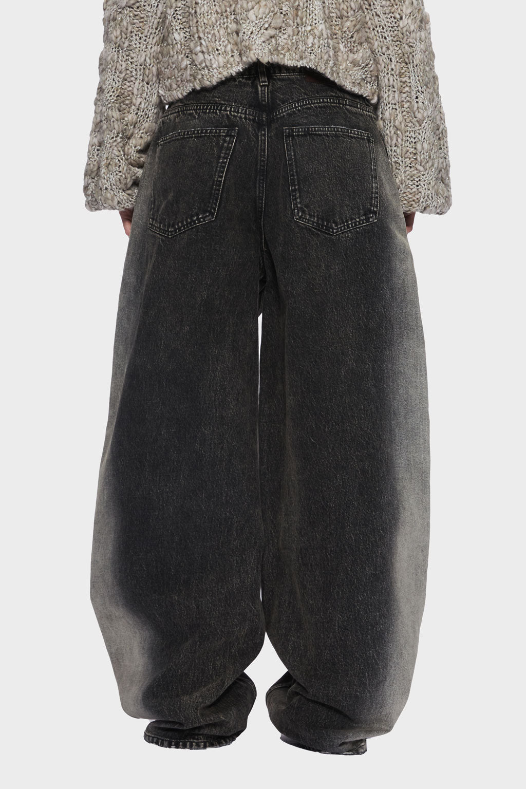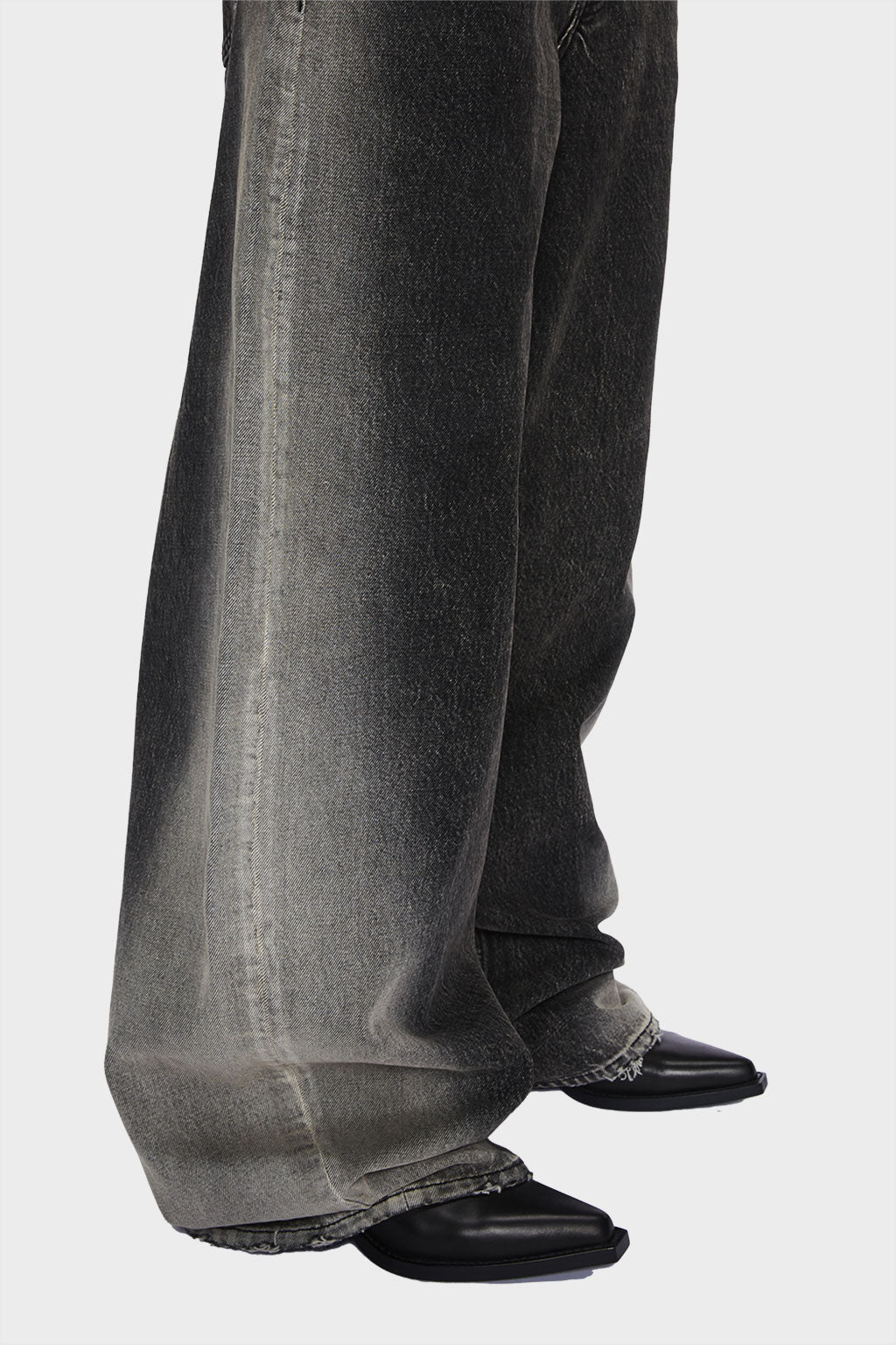 The cotton sourced from Turkey is known for its fine, long fibers and excellent surface luster, making the fabric exceptionally soft and comfortable against the skin. The fabric has a rugged texture with distinctive slub patterns in both the warp and weft, and after multiple washes and special treatments, it showcases a premium vintage denim style. The mid-rise fit offers comfort, while the irregular distressed design adds a unique and personalized visual appeal to each piece. A black leather patch complements the black-gray wash, and the back yoke line enhances the shape of the hips, emphasizing curves. The wide-leg cut creates a powerful presence, with a small side slit adding a touch of dynamic flair and effortless style.