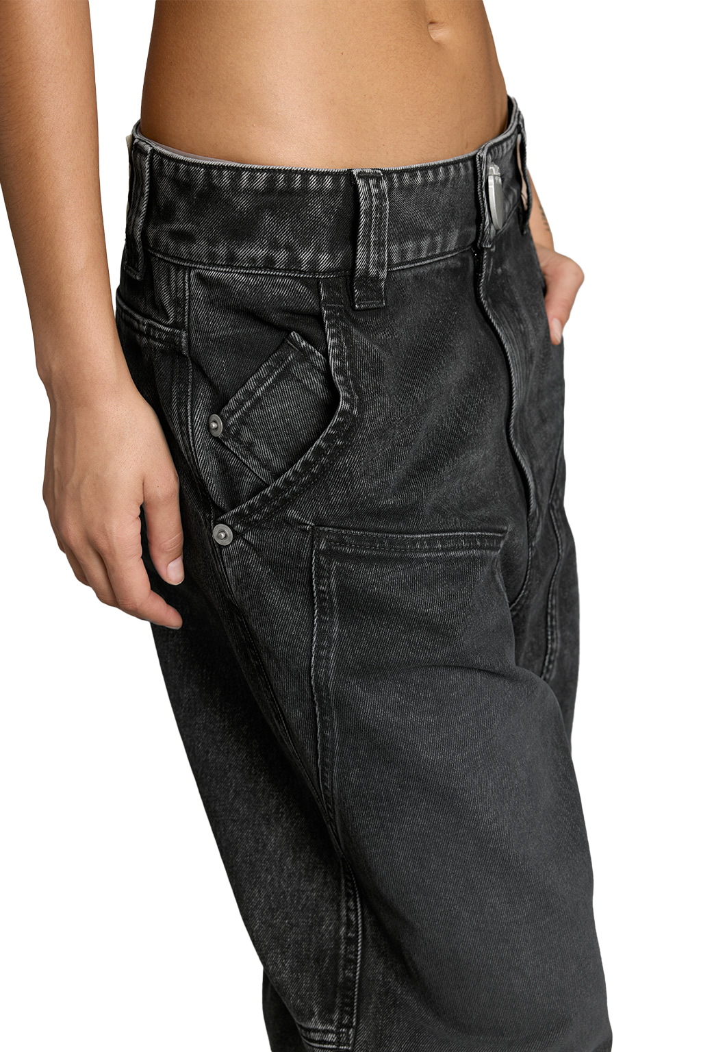 Crafted from selected high-quality black cowhide fabric, with clear grain patterns and a structured, wide appearance. Processed through multiple enzymatic washing and treatments, it presents a naturally aged classic vintage style, each piece unique, interpreting the texture and versatility of denim in a retro style. The black-grey wash gives a nostalgic atmosphere, complemented by whisker patterns, showcasing a ruggedly handsome charm. The leather patch on the back complements the main color tone, featuring classic York seams for buttock enhancement. The wide-leg silhouette offers a relaxed fit with ample room, adorned with unique frayed edges on each piece, enhancing its youthful and stylish appeal.